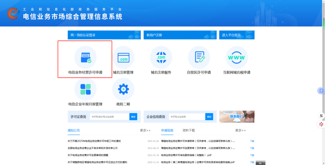 (一)申请者注册登录“工业和信息化部政务服务平台--电信业务市场综合管理信息系统”(域名:https://dxzhgl.miit.gov.cn/#/home),点击“电信业务经营许可申请”;