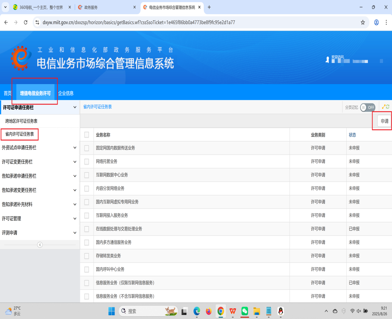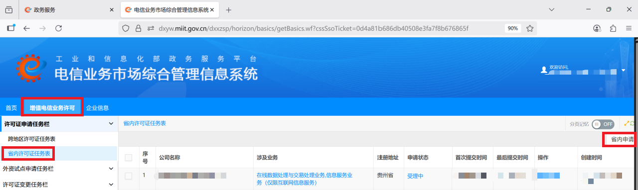 (三)登录之后点击“增值电信业务许可”→“许可证申请任务栏”→“省内许可证任务表”→选择业务类型,点击“申请”,按要求上传材料。