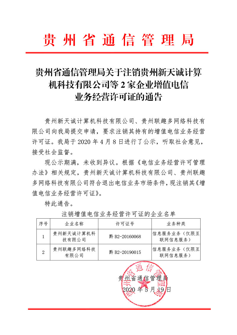 贵州省通信管理局关于注销贵州新天诚计算机科技有限公司等2家企业增值电信业务经营许可证的通告