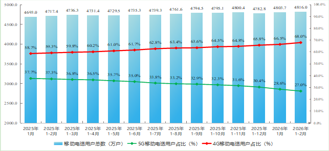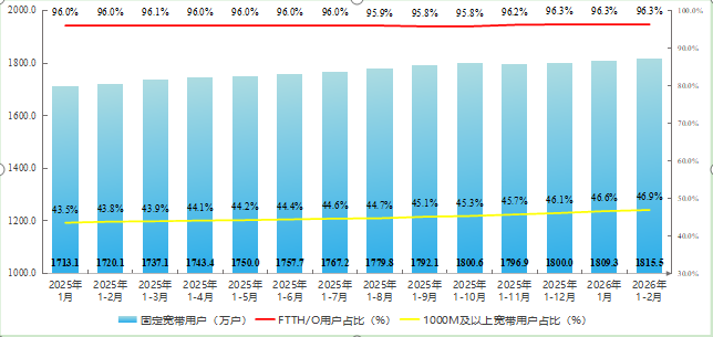 2026年1-2月,贵州通信业运行平稳,电信业务总量保持增长,增速高于全国平均水平。千兆宽带、5G用户规模持续扩大,5G移动互联网用户接入流量保持快速增长,双千兆网络基础设施建设稳步推进。