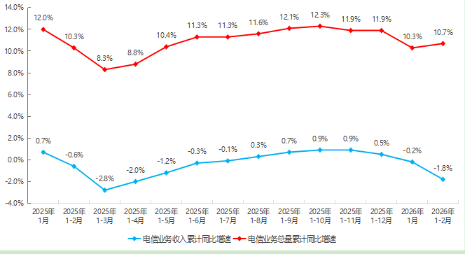 话音业务量持续萎缩,短信业务规模下降。1-2月,固定电话主叫通话时长0.9亿分钟,同比下降5.1%;移动电话去话通话时长117.1亿分钟,同比下降3.1%。移动短信业务量30.1亿条,同比下降14.7%。